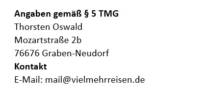 Die Adresse unserer Website ist: https://www.vielmehrreisen.de. Es wird ein privater Blog betrieben mit Reiseberichten, Empfehlungen und Links zu Anbietern von Produkten und Dienstleistungen zum Thema.